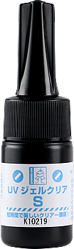 UVジェルクリアを硬化させるには別売の「M-09s スーパー UVライト」を使用してください。約5㎝ほど離れたところから照射させて硬化させます。厚さにもよりますが、約60秒で硬化します。